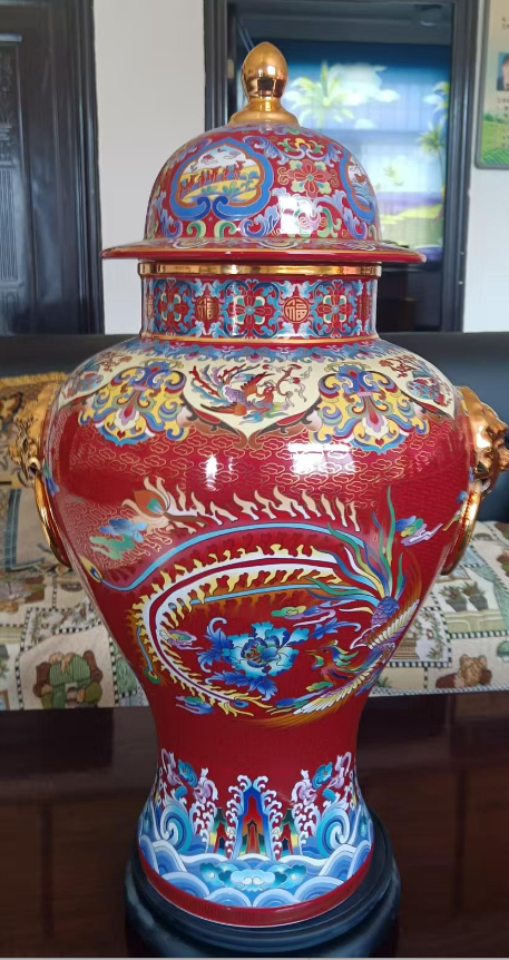 铜胎掐丝珐琅(景泰蓝)双龙耳六方瓶