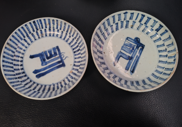 清代青花万寿纹盘一对