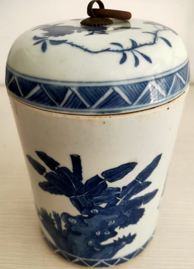 称康熙青花洞石芭蕉纹带盖瓷罐