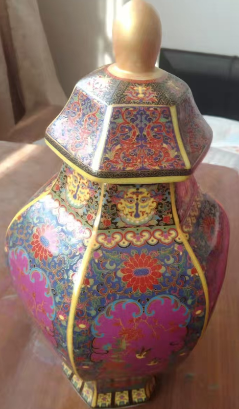 铜胎掐丝珐琅(景泰蓝)双龙耳六方瓶