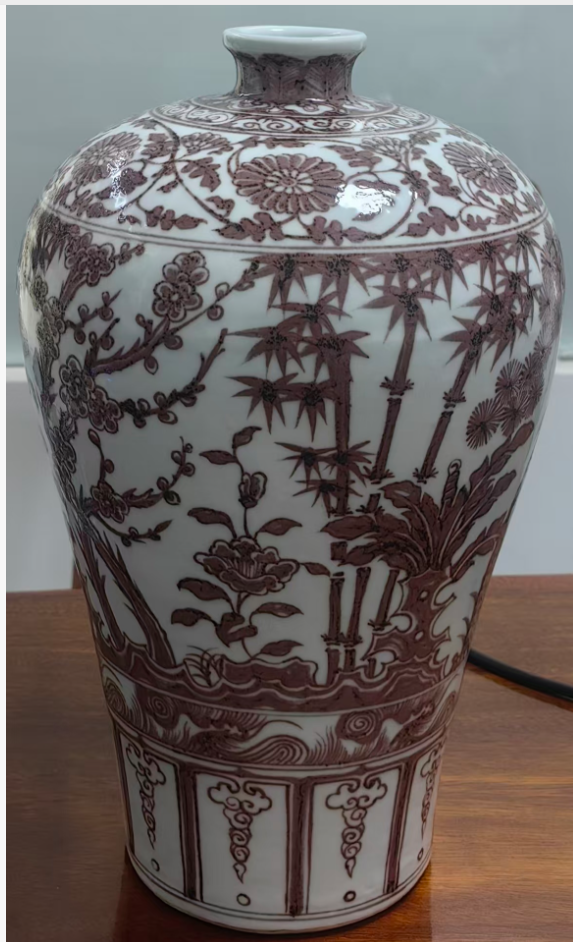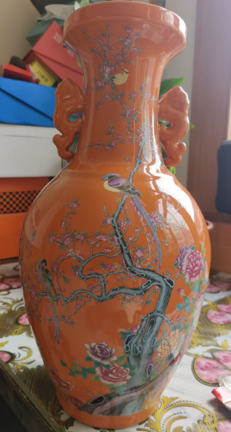 珊瑚红地粉彩花鸟纹双耳瓶一对