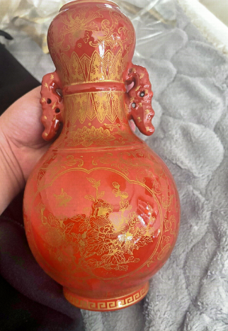 矾红描金双耳蒜头瓶