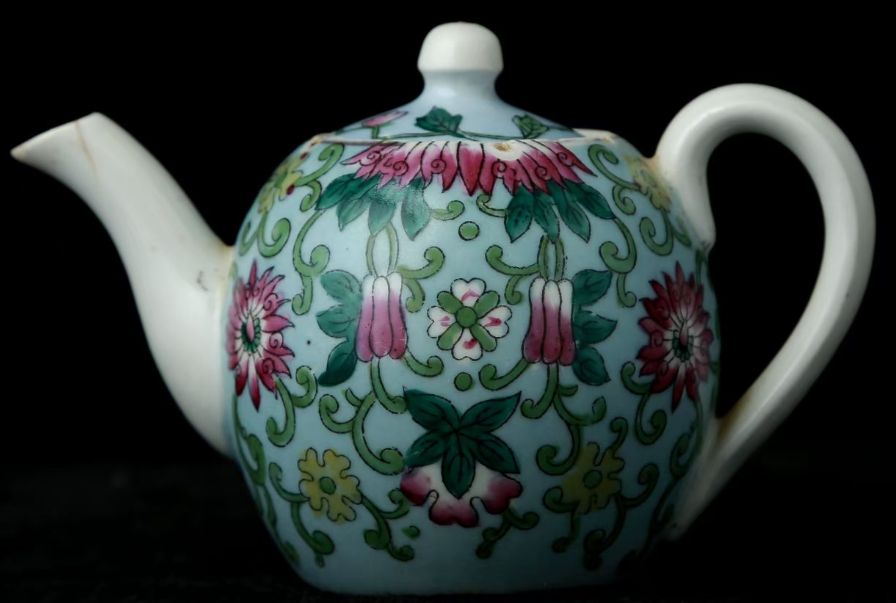 天蓝地粉彩缠枝花卉纹茶壶