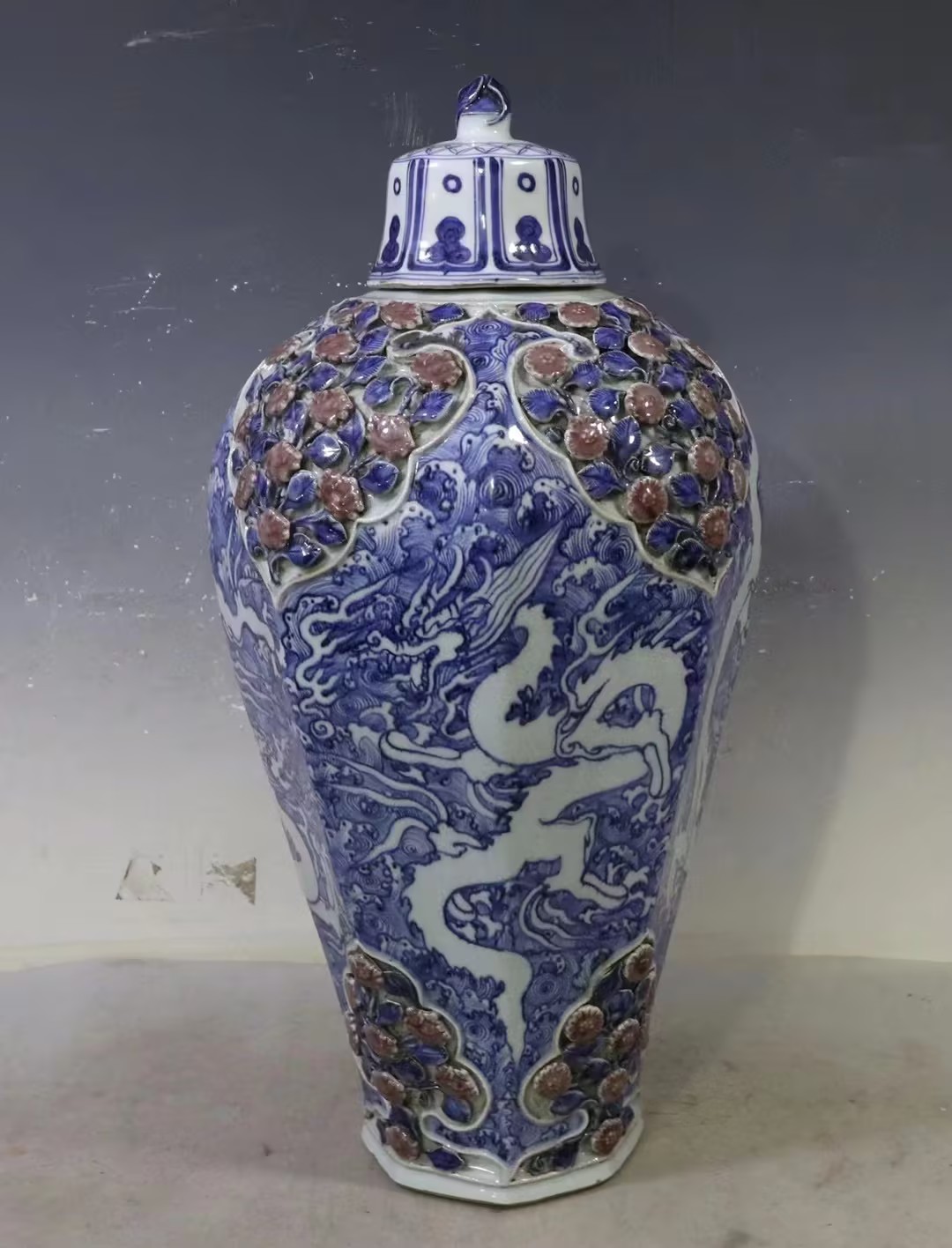 元青花釉里红海水白龙纹雕塑花卉带盖八方梅瓶
